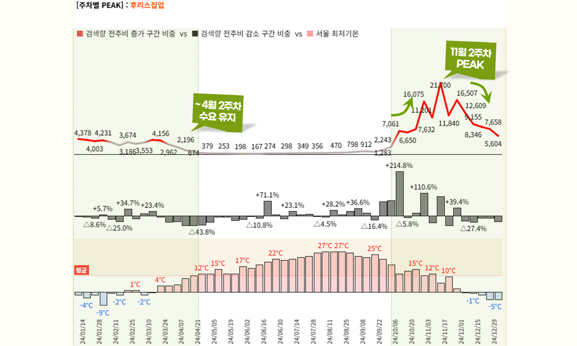 ์ ์์๋ ๋ณธ๊ฒฉ ์ถ์ ์ ๋ฏธ๋์จ์ด ์์ + ์์๋์ด ์คํ์ผ ํ์ฐ์ด ํจ๊ป ์์ฉํ๋ฉฐ, 11์ 2์ฃผ์ฐจ์ PEAK๋ฅผ ์ฐ๊ณ 4์ 2์ฃผ์ฐจ๊น์ง ์ด์ด์ ธ์.