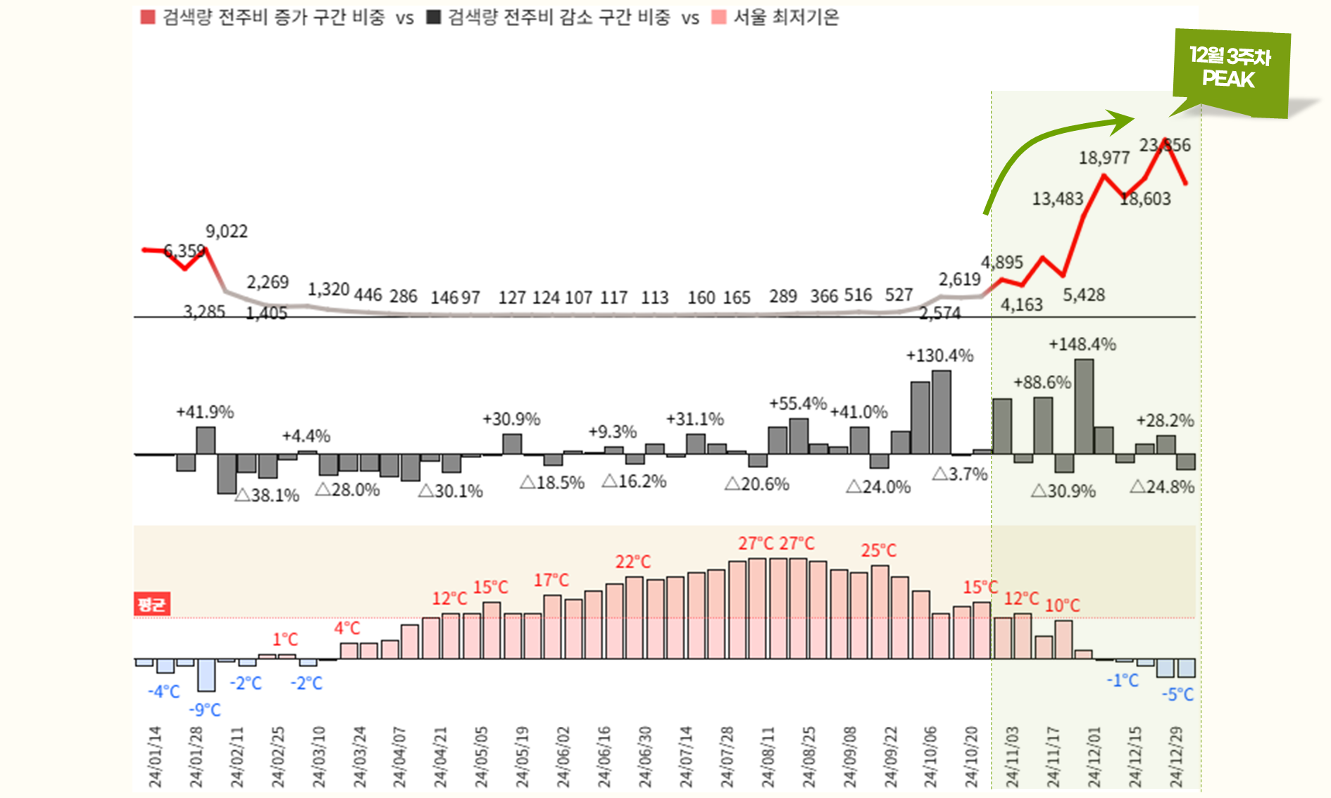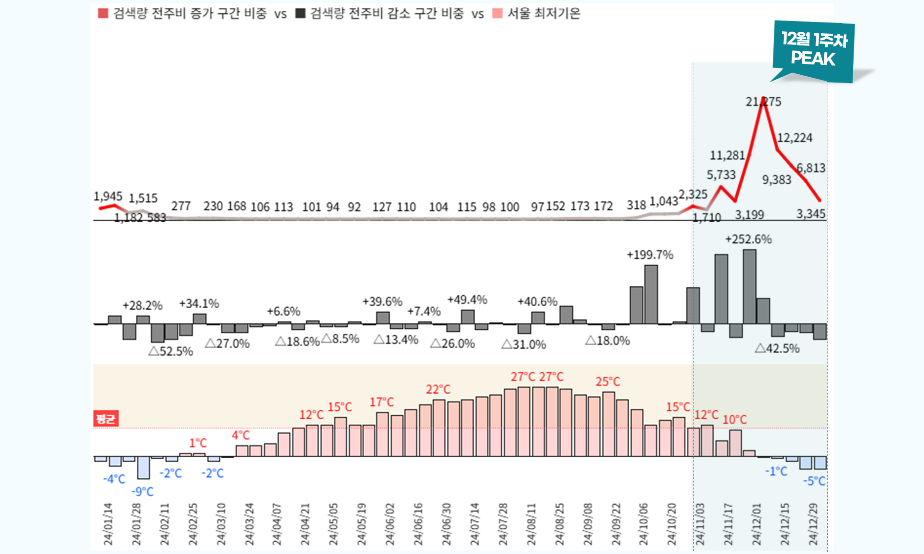 ํจ๋ฉ๋ฐ์ง์ ์์๋ ์ฃผ ํ๊ท ์ต์ ๊ธฐ์จ์ด(์์ธ ๊ธฐ์ค) ์ํ๋ก ๋จ์ด์ง ๋ ์์๊ฐ ํญ๋ฐ์ ์ผ๋ก ์ฆ๊ฐํ์ฌ 12์ 3์ฃผ ์ฐจ PEAK์์.