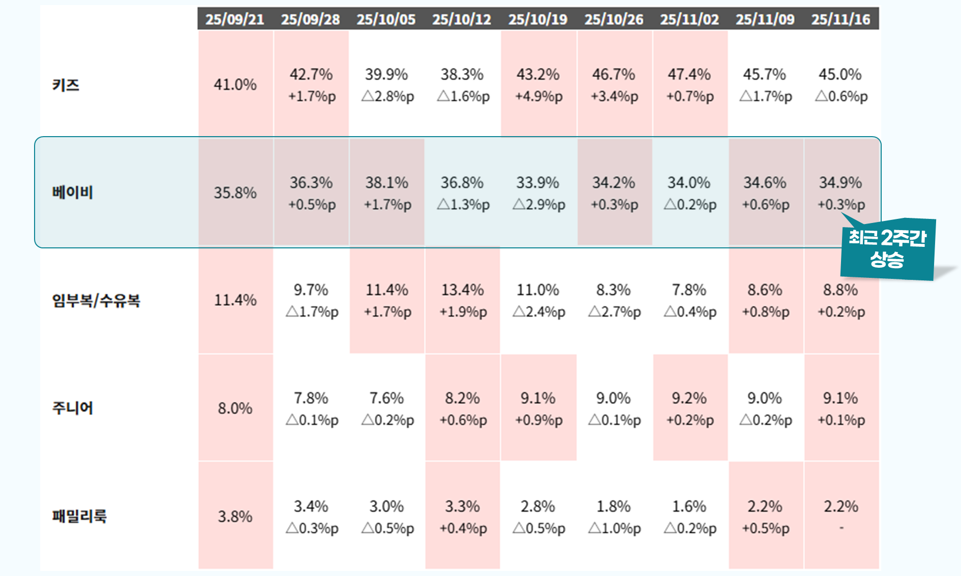 * ์ถ์ฒ : ์ฑ์ธ ๊ฒ์ PEAK ํธ๋ ๋_์ฃผ๊ฐ / [0] ํตํฉ ๊ฒ์ Trend (25-11-16 ์ฃผ์ฐจ ๊ธฐ์ค, Keyword)