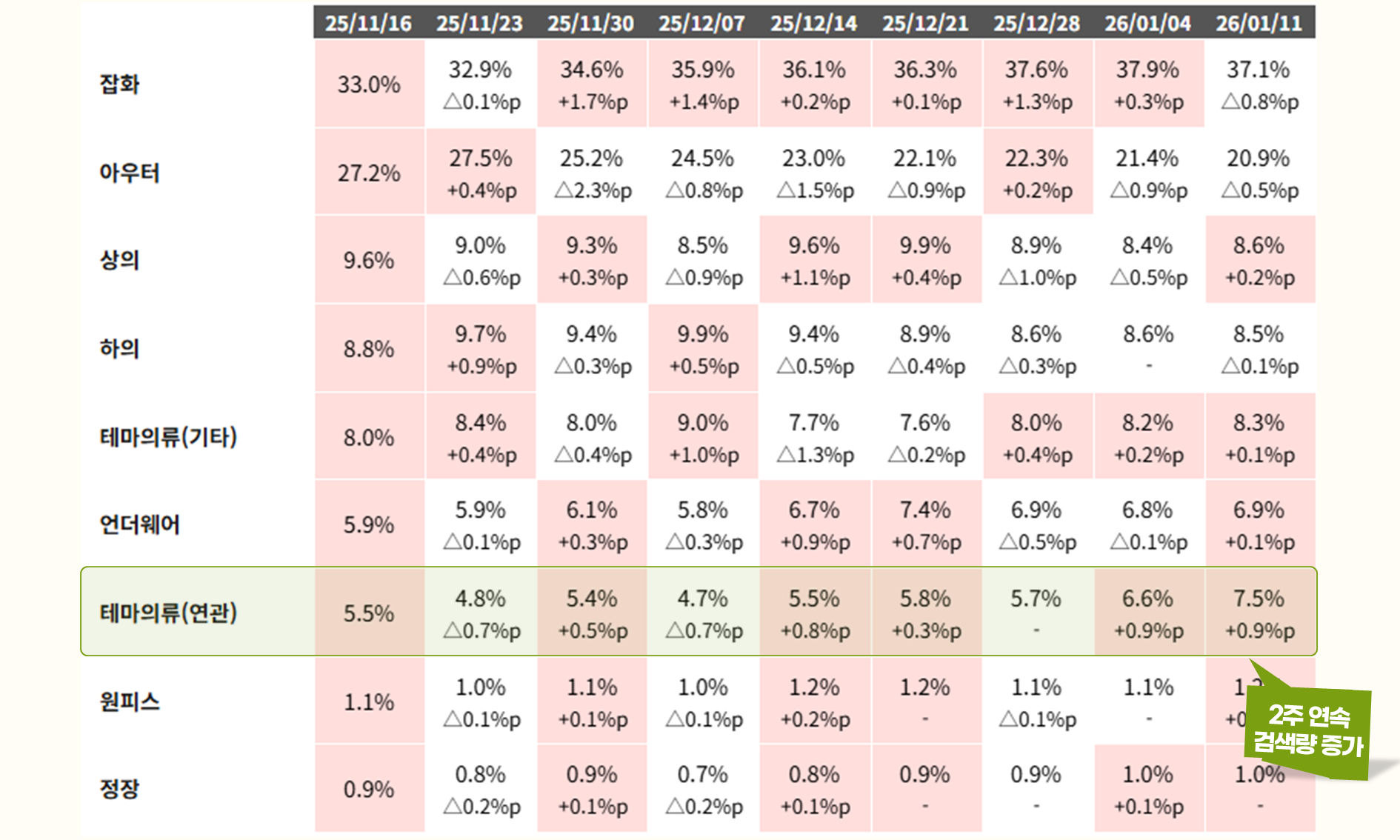 * ์ถ์ฒ : ์ฑ์ธ ๊ฒ์ PEAK ํธ๋ ๋_์ฃผ๊ฐ / [1] Quick_Review (+๊ธฐ์จ) (26-01-11 ์ฃผ์ฐจ ๊ธฐ์ค, 1 Depth) |