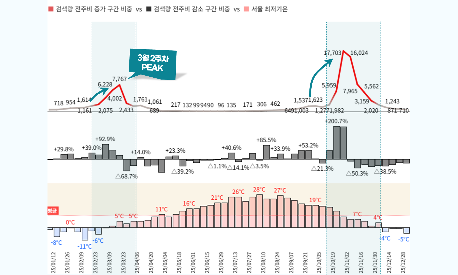 ๋๋ณต์ 1์๋ถํฐ ์์๊ฐ ์์นํ์ฌ ํ๊ท ๊ธฐ์จ์ด ์ฌ๋ผ๊ฐ๋ 4์ 4์ฃผ์ฐจ๊น์ง ์์ PEAK๋ฅผ ์ ์งํด์.
